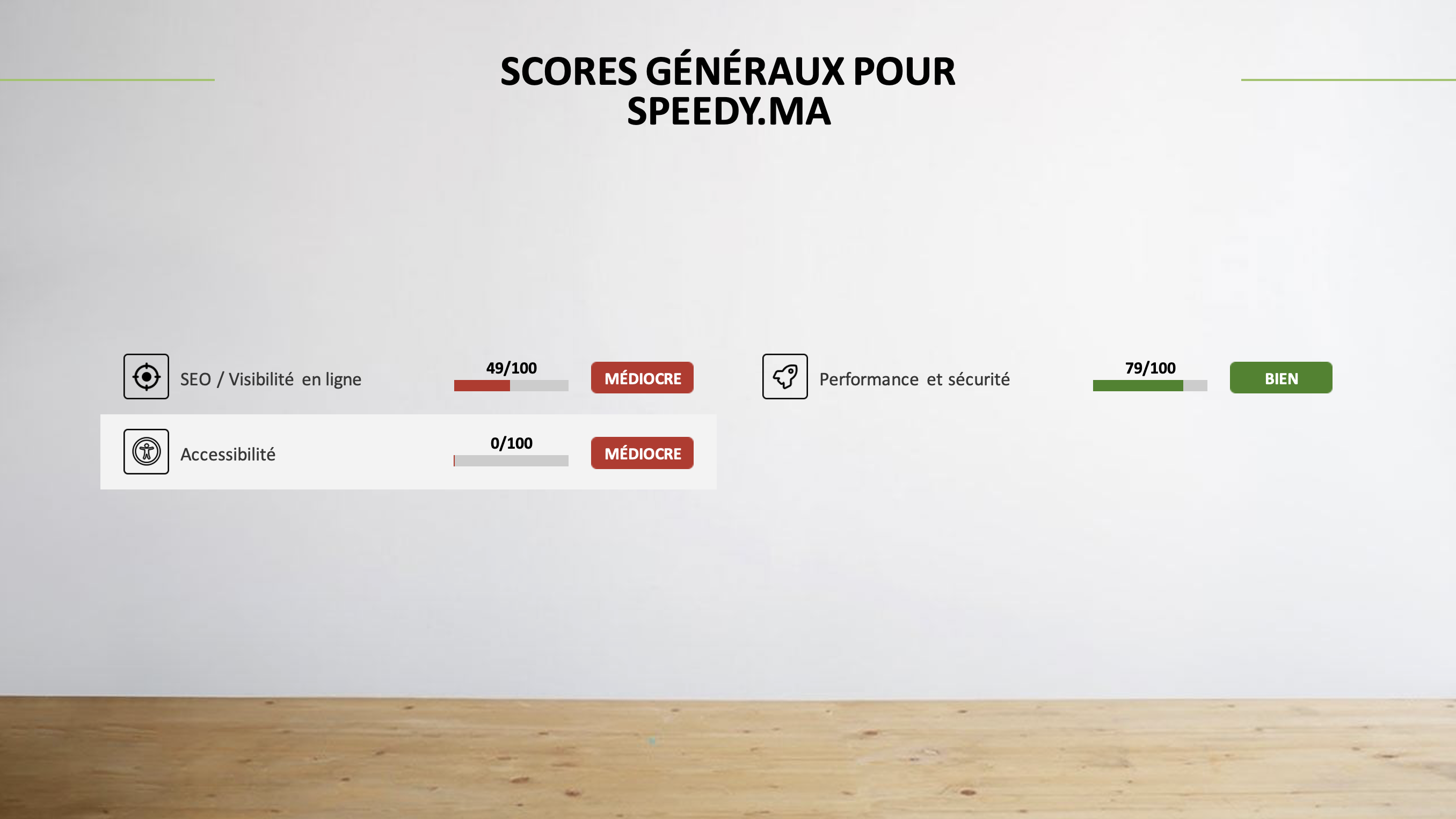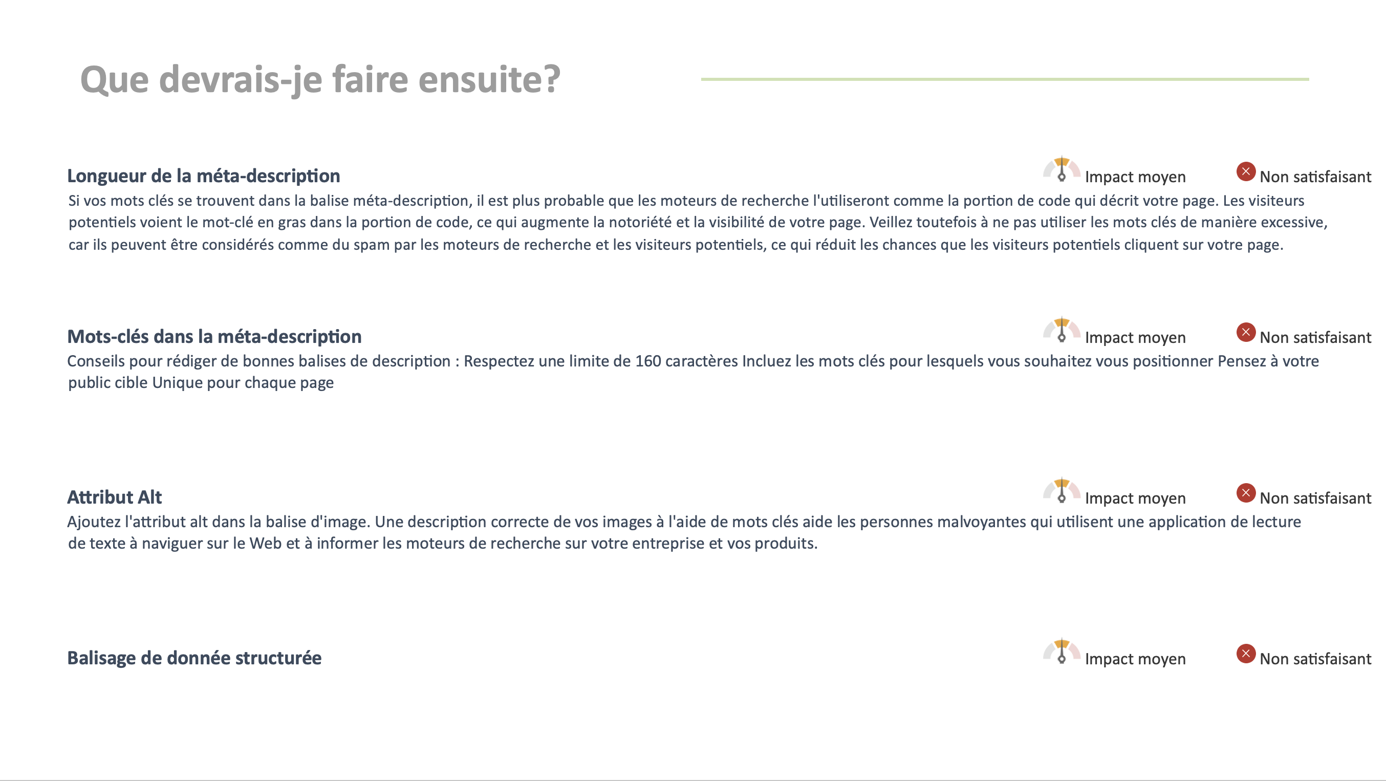 Nous vous enverrons un rapport complet en langage clair et sans jargon contenant des recommandations prioritaires, mesurant tout ce qui est essentiel pour assurer le succès en ligne de votre entreprise en 2025.
